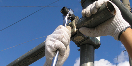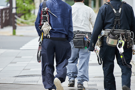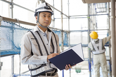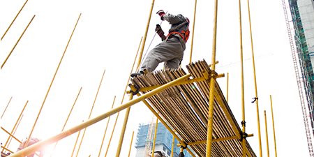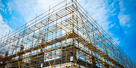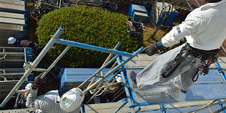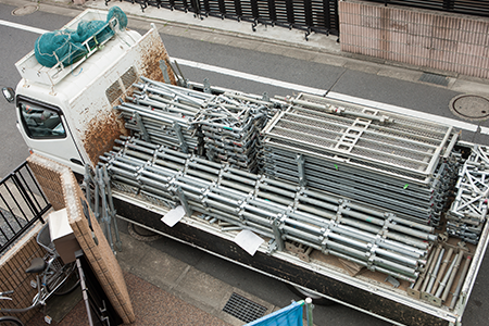 足場工事とは、建築現場など高所で作業をする際に、足元を支える足場の工事のこと。